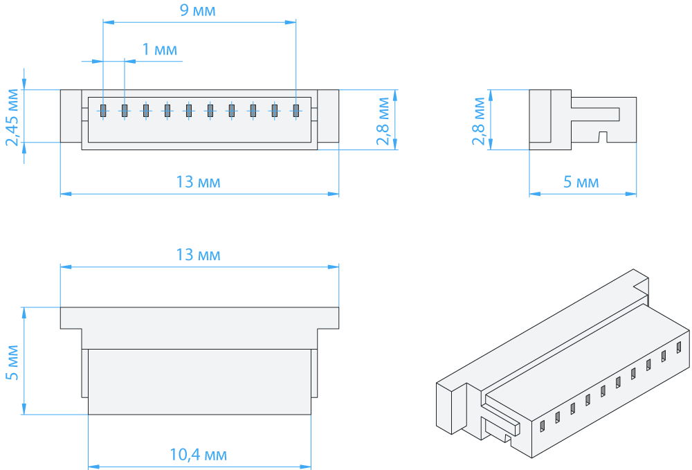 - Разъём JST SH1.0 «Папа» (10 pin) — ответная часть для конектора JST SH1.0 «Мама».