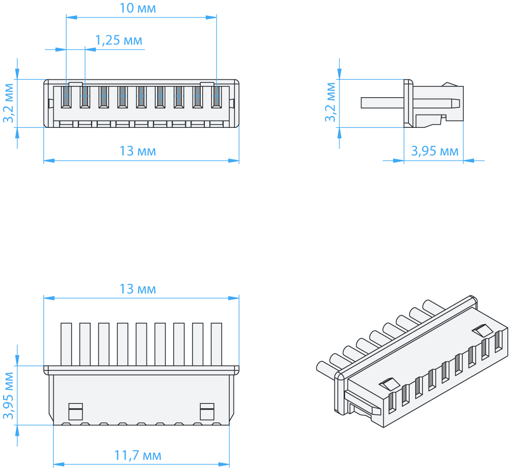 - Разъём JST MX1.25 «Папа» (9 pin) — ответная часть для коннектора JST MX1.25 «Мама».